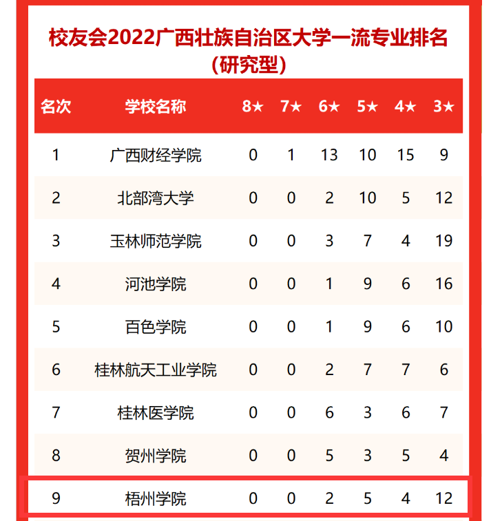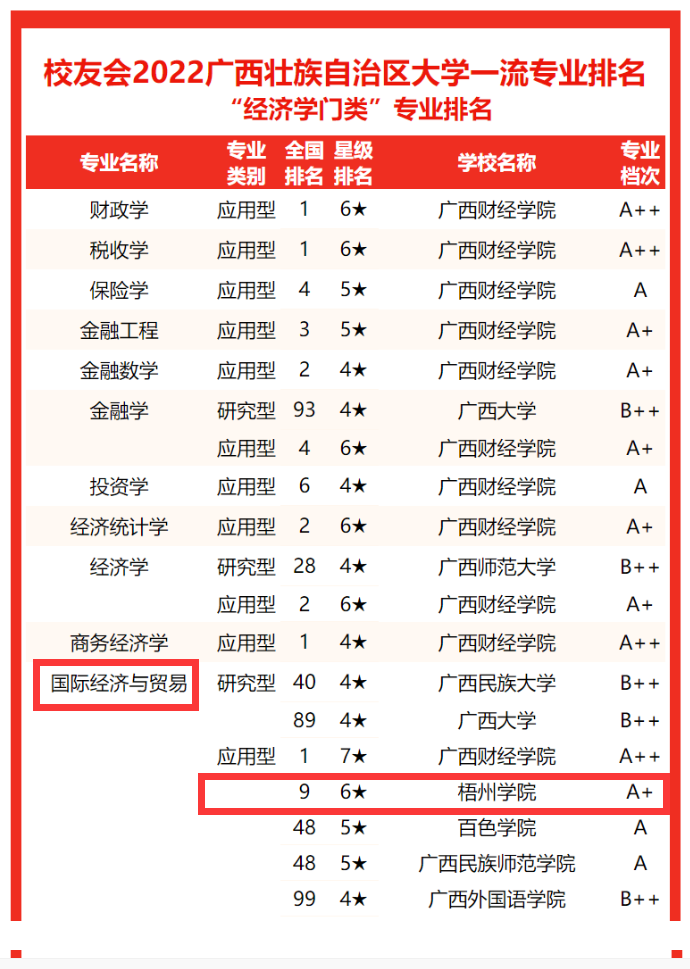 2022年3月30日,全国第三方大学评价机构艾瑞深校友会网撰写、科学出版社出版发行的《2022校友会中国大学排名--高考填报志愿指南》发布了2022中国大学一流专业排名榜单。我校的国际经济与贸易专业(应用型)在广西壮族自治区大学一流专业排名中,专业档次A+。