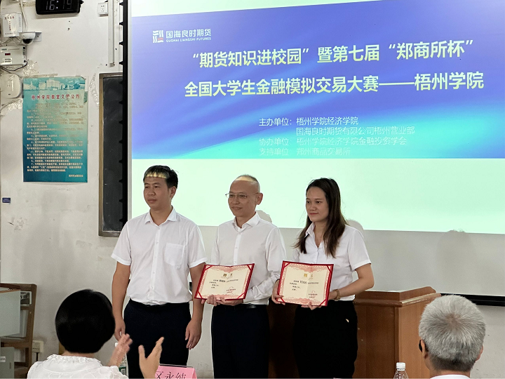 接着,国海良时期货公司梧州营业部总经理蔡威林为我校颁发第六届“郑商所杯”优秀组织奖荣誉证书。经济学院党委书记黄焕克为国海良时期货公司梧州营业部总经理蔡威林、客户经理甘洁云颁发校外指导老师聘书。