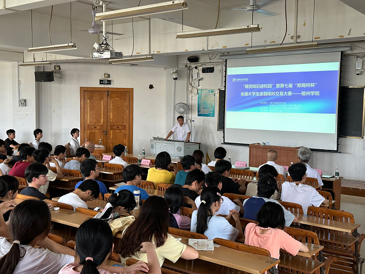 国海良时期货公司梧州营业部客户经理甘洁云、黄俊彬分别为同学们介绍了第七届“郑商所杯”全国大学生金融模拟交易大赛的报名流程及规则、比赛的奖项设置和交易技巧、期货、期权合约解读及交易规则等,让同学们更深入的了解到了期货的相关知识。鼓励同学们积极参加比赛,努力提升自己的专业实操能力。