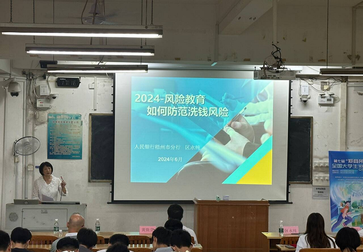 最后,中国人民银行梧州市中心支行反洗钱科科长区永纯从“什么是洗钱、什么是反洗钱”为同学们讲述洗钱的危害、如何防范洗钱风险。通过对实际案例解读分析,让同学们更好地了解到期货交易中的风险,学好理财知识,切勿跟风投机,提醒同学们不要轻信骗局。