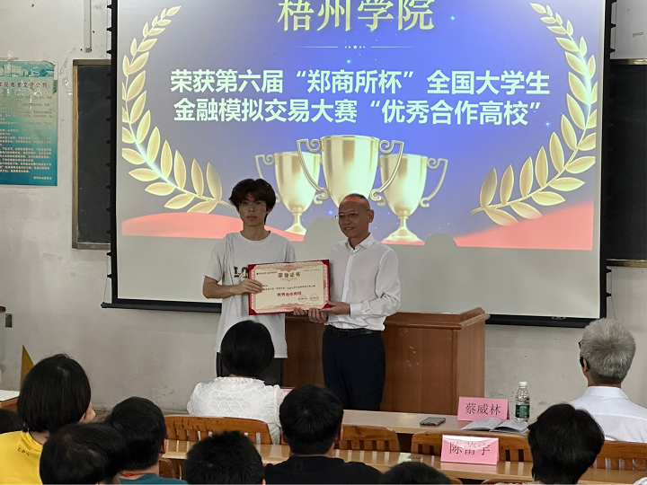 国海良时期货梧州营业部总经理蔡威林为我校颁发第六届“郑商所杯”荣誉证书