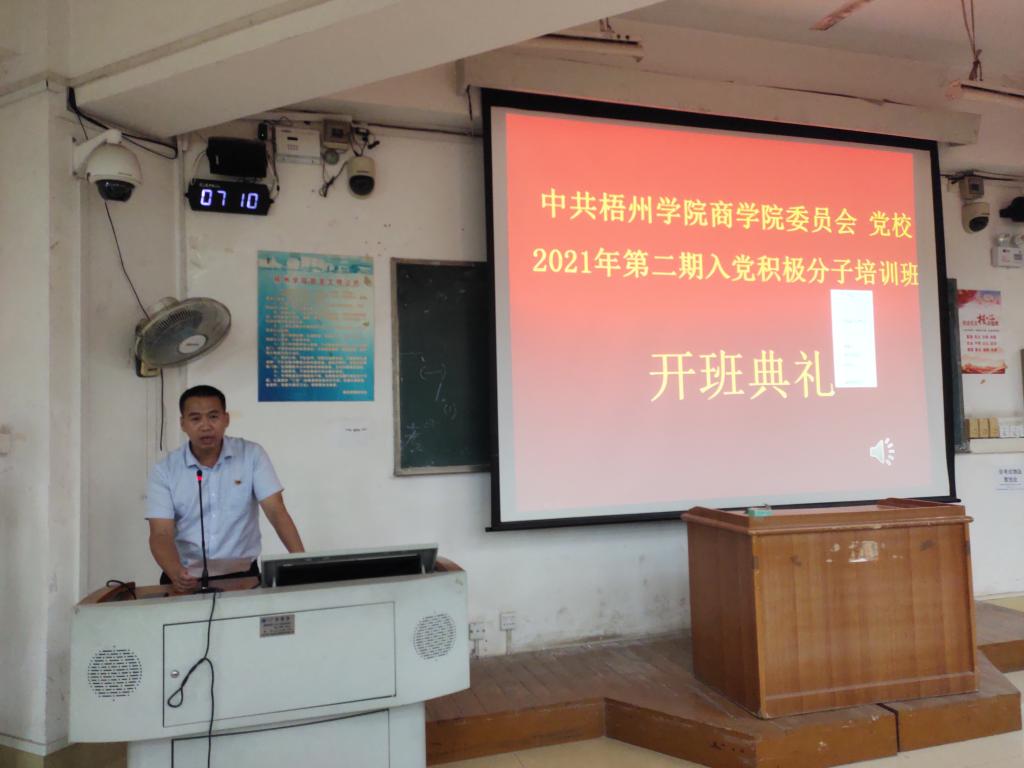 开班典礼第一项议程是全体学员起立并奏唱中华人民共和国国歌;接着由学院党委副书记、党校副校长黄焕克致辞;最后,由黄焕克同志宣布梧州学院商学院2021年第二期入党积极培训班正式开班!