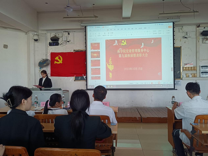 10月15日下午3:00,商学院党建中心在明理楼S503召开了第九届干部换届暨表彰大会。商学院党委书记黄焕克、各学生党支部书记、校党建中心及其他二级学院党建中心代表、商学院各团学组织、各支部支委、各班级代表参加会议。会议由秘书部苏子玉主持。