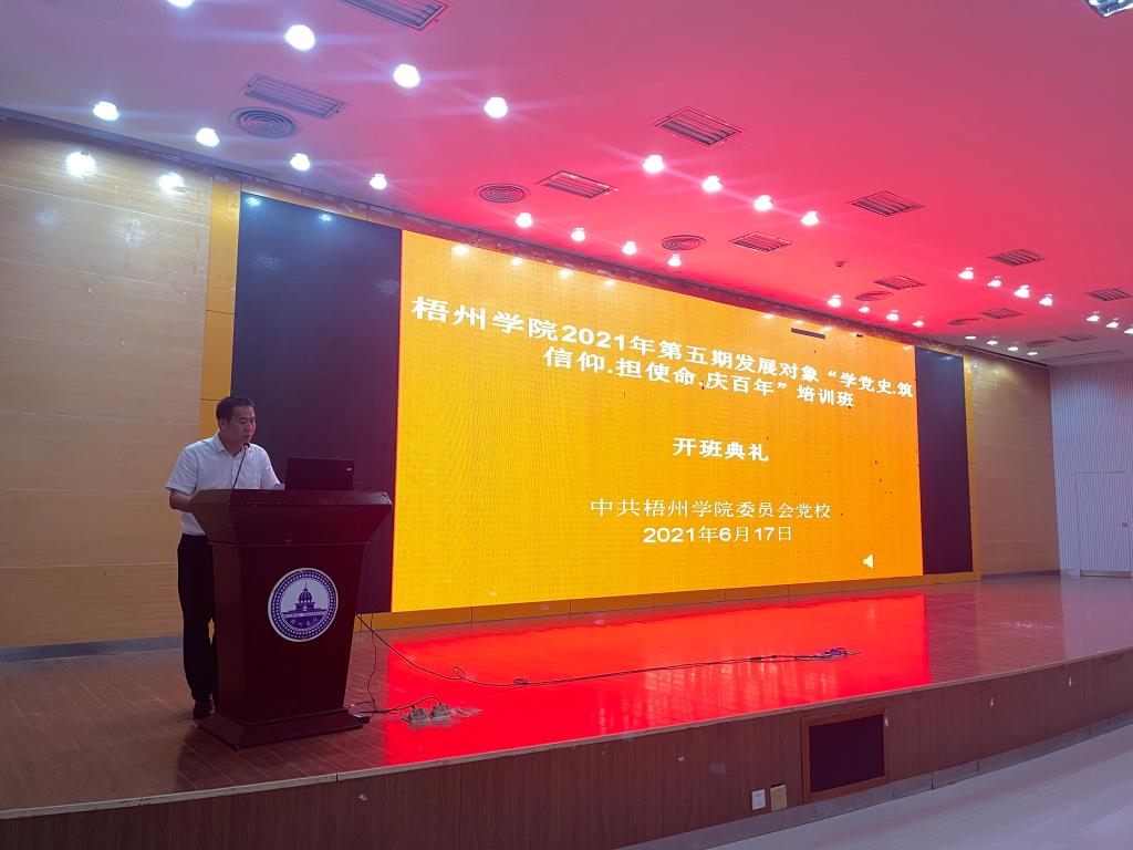 2021年6月17日下午16:30,梧州学院2021年第五期发展对象培训班开班典礼在明理楼学术报告厅举行。商学院党委副书记、党校副校长黄焕克,党建专职组织员、培训班班主任巫汉平出席了本次开班典礼。开班典礼由秘书部汪洋勤同志主持。