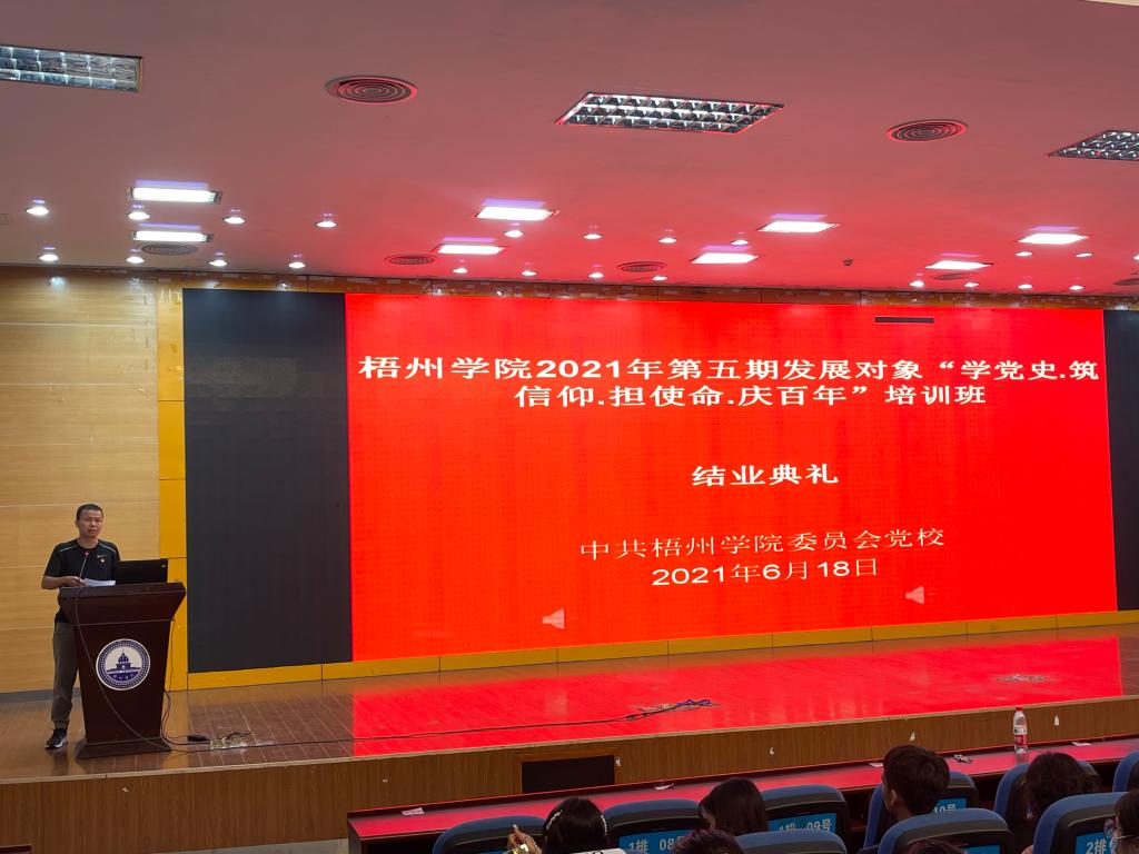 6月18日下午18:30,梧州学院第五期发展对象培训班结业典礼在明理楼学术报告厅举行。商学院党委副书记、党校副校长黄焕克,党建专职组组员、培训班班主任巫汉平出席结业典礼,典礼由秘书部干事汪洋勤主持。