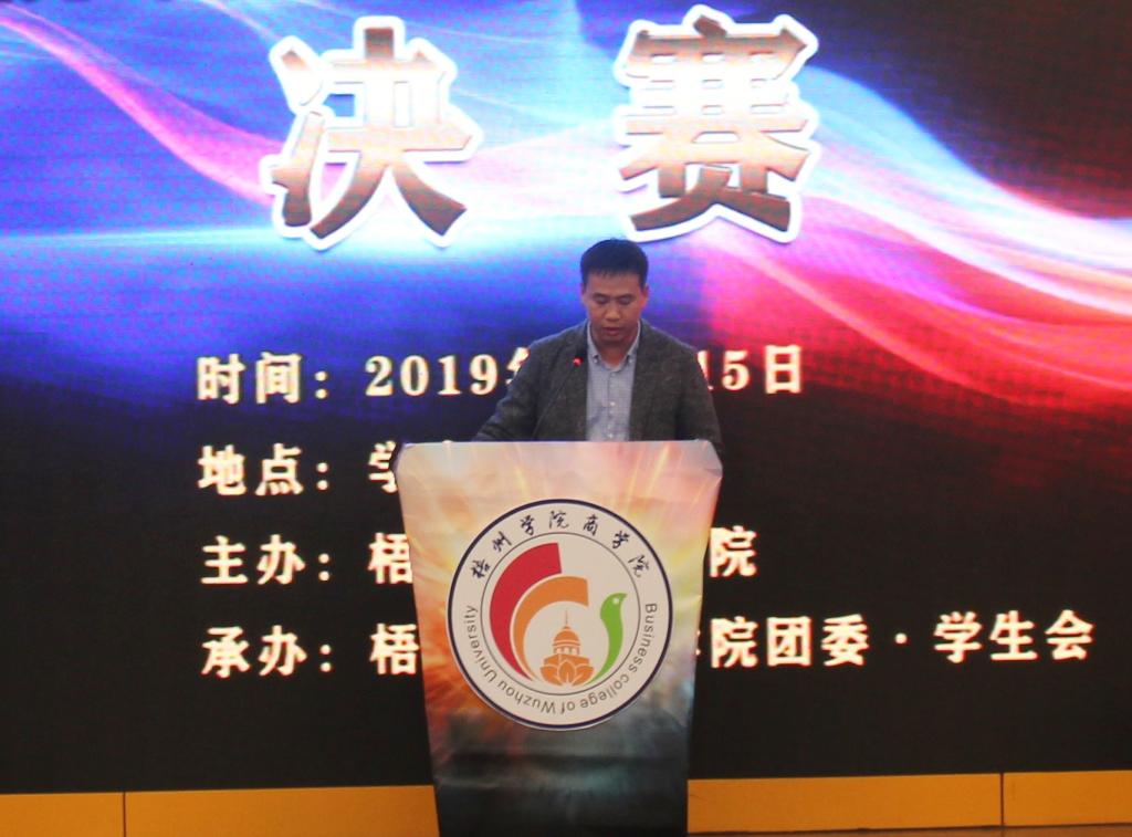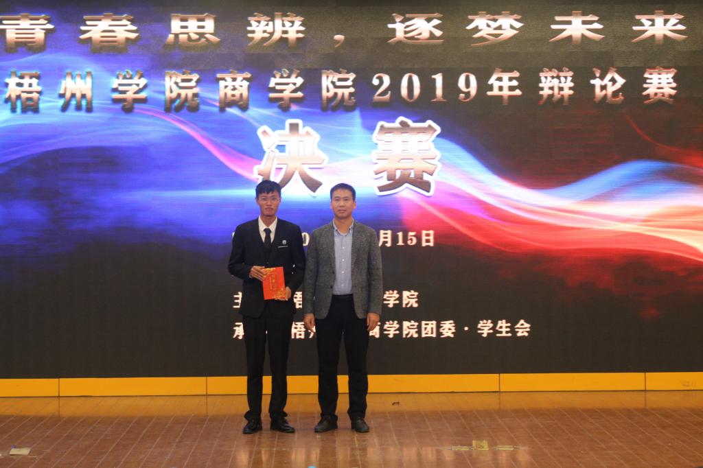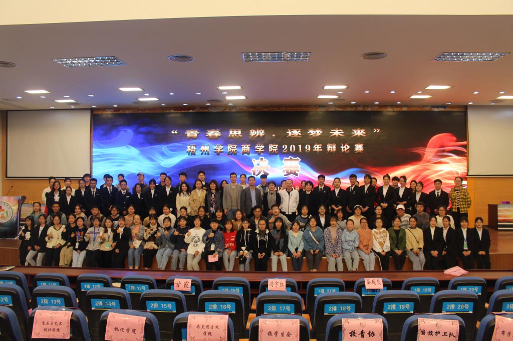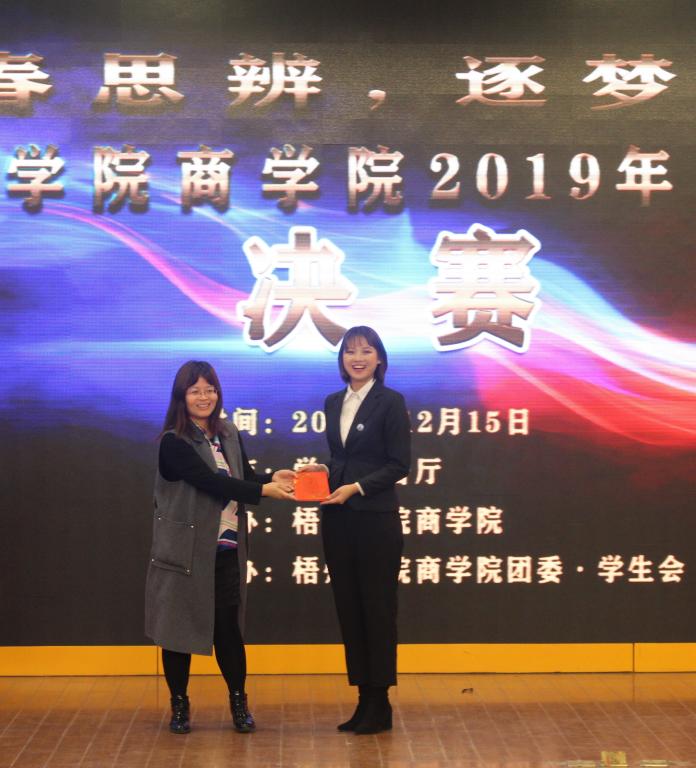 12月15日晚19:30,梧州学院商学院在明理楼学术报告厅成功举办2019年“青春思辨,逐梦未来”辩论赛决赛。梧州广播电视台综艺节目部主任、梧州中华文化促进公务理事、梧州朗诵专业委员会主任冯宇红、梧州朗诵专业委员会副主任、梧州学院文学与传媒学院副教授秦廷良、校友工作科科长甘霞、中共梧州学院商学院委员会副书记黄焕克、共青团梧州学院商学院学生工作办公室主任、团委书记罗程飞、商学院辅导员钟懿博、杜艳华、肖雅予、谢兵出席本次活动。冯宇红老师、甘霞老师、秦延良老师担任辩论赛评委。