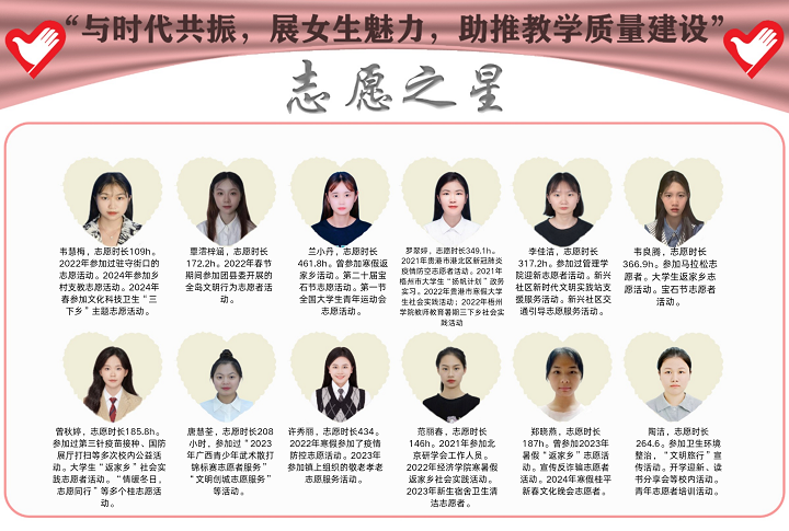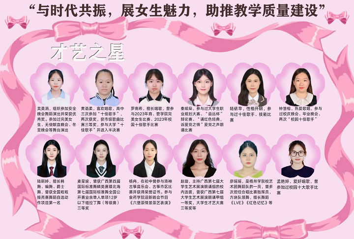 本次“完美女生”比赛由校团委主办,经济学院团委承办,主要围绕“德、智、体、美”等方面素养,分学习之星、志愿之星、才艺之星等三个赛道,通过上个学年考察期评成绩、志愿服务时长、才艺比拼等评选,经初赛、复赛、决赛,分别评选出李钦莲等12名学习之星,兰小丹等12名志愿之星,赵璇等12名才艺之星。通过树立榜样力量,以点带面,倡导优良学风,助推学校教学质量建设。