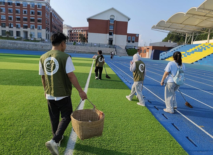 志愿者打扫田径场