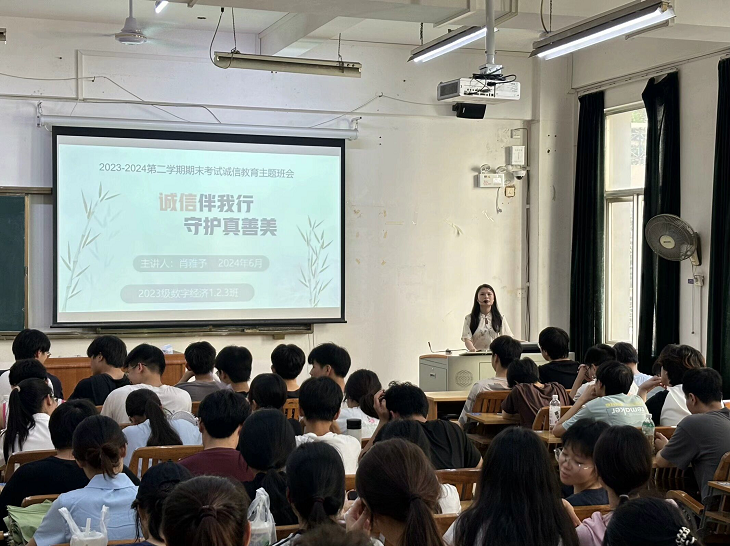 6月21日下午,数字经济1、2、3班在明理楼S204召开以“诚信伴我行,守护真善美”为主题的诚信教育班会。此次会议由辅导员肖雅予主持,2023级数字经济1、2、3班全体学生参加会议。