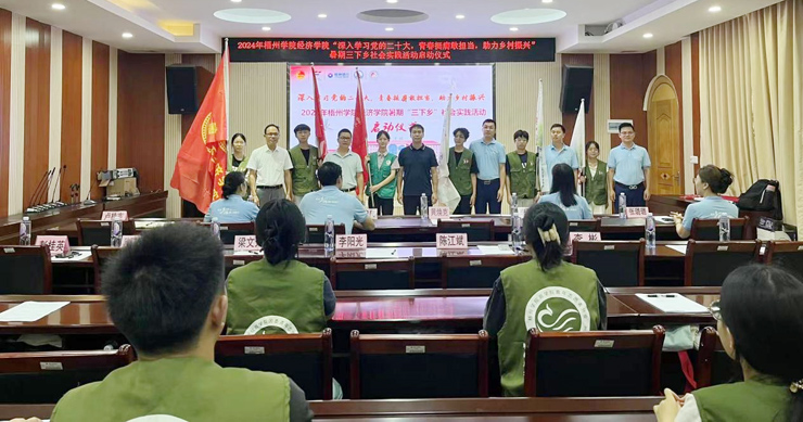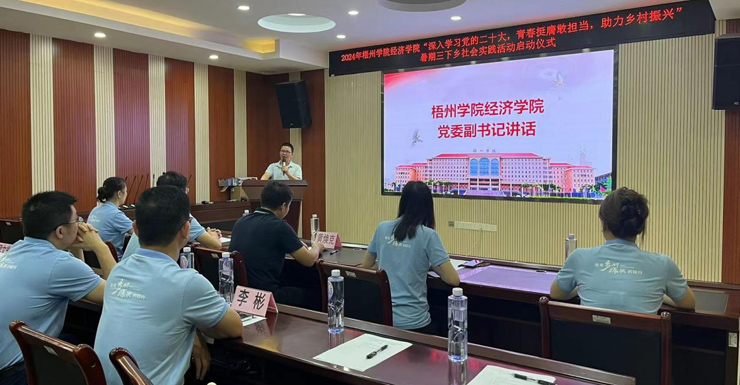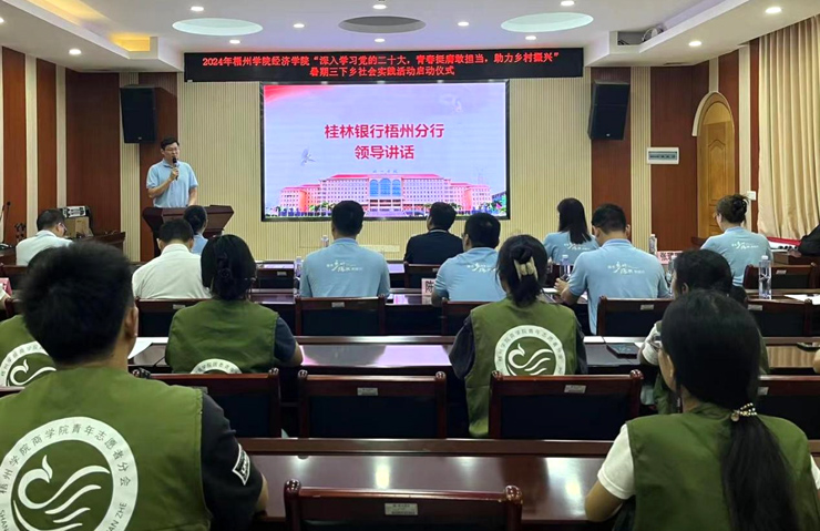 桂林银行梧州分行行长杜忠良在启动仪式上发表致辞,赞扬了学生们的积极态度,表示桂林银行将大力支持学生社会实践活动。学生代表王思琪同学表示将用实际行动践行青春誓言,为乡村振兴贡献自己的力量,为自己的未来打下坚实的基础。卢桂吉则强调了实践育人的重要性,并鼓励学生们将所学知识运用到乡村振兴中。经济学院各领导和桂林银行梧州分行领导为实践团授旗。
