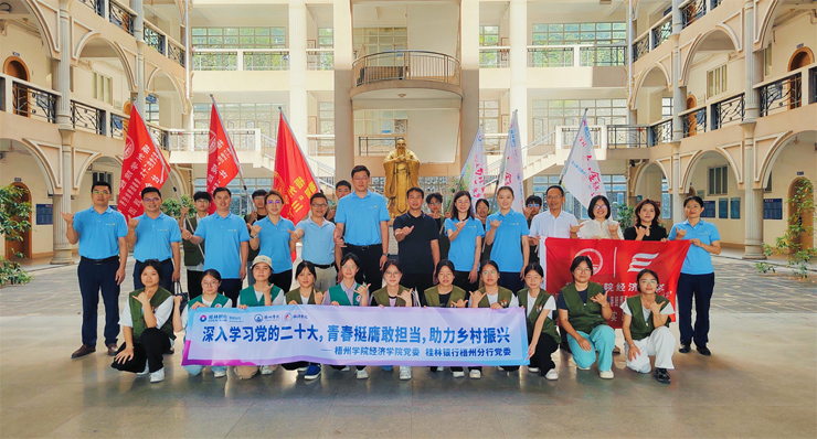 7月8日上午,我院与桂林银行梧州分行共同举办“深入学习党的二十大,青春挺膺敢担当,助力乡村振兴”暑期三下乡社会实践启动仪式。桂林银行梧州分行行长杜忠良、综合办公室主任徐丽斯、人力资源部总经理李翠林、乡村金融工作部总经理张璐璐、岑溪支行行长陈江斌,苍梧支行行长李彬、蒙山支行行长李阳光,经济学院党委书记黄焕克、党委副书记卢桂吉、副院长梁文光、学院团委副书记彭桂英、学院团委青年委员欧阳天婷,以及学院暑期三下乡社会实践团成员参加启动仪式。