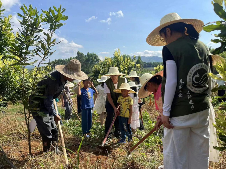清晨,促进团成员与岑溪市电视台工作人员踏入新塘村火龙果基地。即便烈日当空,亦难阻其热忱,以镜头为笔,写出火龙果的勃勃生机,旨在拓宽农产品的市场边界,为农户搭建起通往广阔市场的桥梁。上午十点,一行人移步至小小银行家俱乐部实践基地,与小朋友们共赴一场“绿色之约”。在坚果树下,大家挥汗如雨,锄草浇水,不仅滋养了土地,更在孩子们心中播下了劳动光荣的种子。此番互动,不仅加深了促进团成员对劳动价值的深刻理解,也彰显了新时代青年对社会责任的担当与传承。午后时光,促进团成员探访了海杰村的一位老奶奶。在倾听了老奶奶的经历和身体近况后,深刻体会到了乡村振兴之路不仅仅是经济的繁荣,更是人心的温暖与情感的联结。走访乡村,是了解民情、倾听民意的重要途径,更是乡村振兴不可或缺的人文关怀。