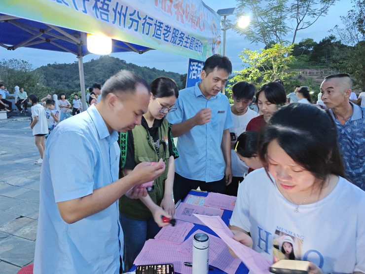 为助农增收,普及反诈知识,共筑乡村振兴美好未来。7月18日晚,梧州岑溪水汶镇南禄村五世衍祥牌坊长寿公园内灯火辉煌,人声鼎沸,一场别开生面的“庆丰收·话金融”金融夜市活动在此拉开帷幕。此次活动由我院岑溪乡村振兴促进团与桂林银行梧州岑溪水汶支行联合水汶镇政府、水汶镇派出所、中国电信水汶营业部共同举办。