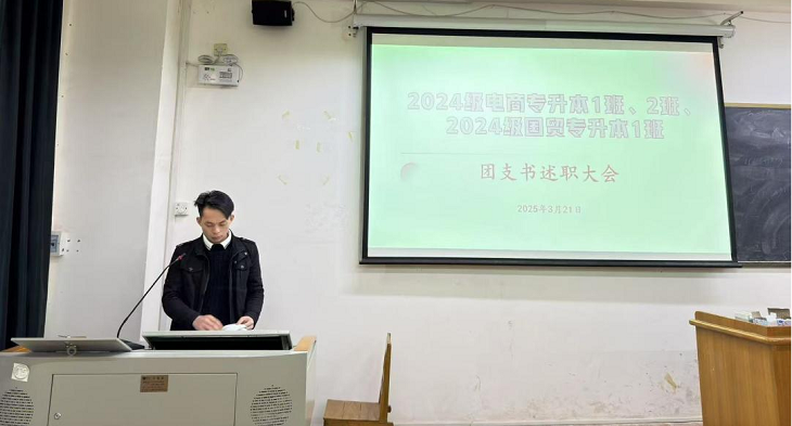 3月21日下午,经济学院在明理楼M304教室召开2024年度团支书述职大会。2024级电子商务专升本1、2班,国际经济与贸易1班专升本班全体班委及学生代表参加,会议由辅导员李建谅主持。