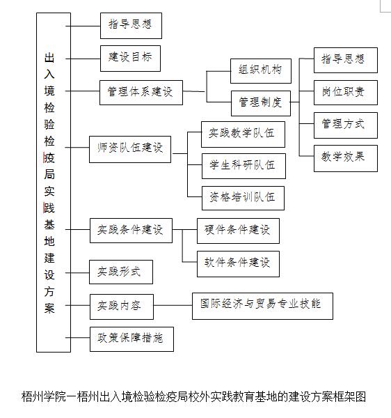 根据高校的人才培养方案及规划,设计联合的人才培养途经并构建联合的人才培养平台,基地在最大限度地利用现有资源,积极创造新的条件基础上,保证人才培养平台正常运行及合理规划,最终实现学院办学理念、办学模式的创新,培养创新型的涉外经济人才。梧州学院与梧州出入境检验检疫局自2006年开始开展校外实践教育方面的合作以来,为梧州学院大力打造大学生校外实践教学基地,探索出行业讲座、课程实习、参观实习、顶岗实习和毕业实习等多种实践教学形式,使学生的社会实践能力和理论水平得到进一步提升,为学生将来的就业和创业打下坚实的基础。按照基地建设方案,梧州学院经济系与梧州出入境检验检疫局将在实践基地、职业资格培训、申报科研项目和产学研结合上进行合作。基地充分发挥梧州出入境检验检疫局作为为广西出入境检验检疫局下设的分支机构,担负着梧州口岸出入境卫生检疫、动植物检疫和进出口商品检验等行政执法工作,基地以梧州出入境检验检疫局为实践平台,辐射各类具有涉外业务的各种类型企业单位及部门,确立了“与小企业灵活合作,与大企业稳定合作,与行业全方位合作”的多层次校外实习基地合作方案,保证实践性教学质量。