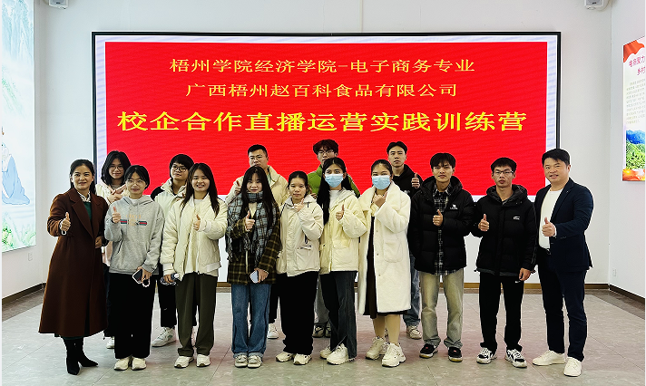 经济学院与梧州赵百科食品有限公司(简称“赵百科公司”)共同将校企合作项目推向深入,以“直播运营”作为第一步开展实质活动。2024年1月12日上午,电子商务专业16名师生组成的“直播运营实践训练营”团队来到赵百科公司,开展第一期活动。
