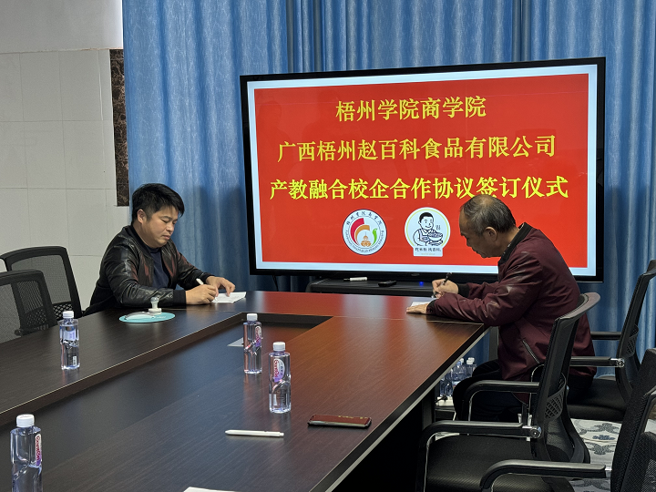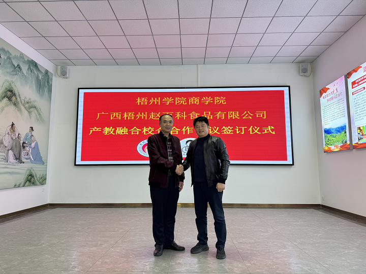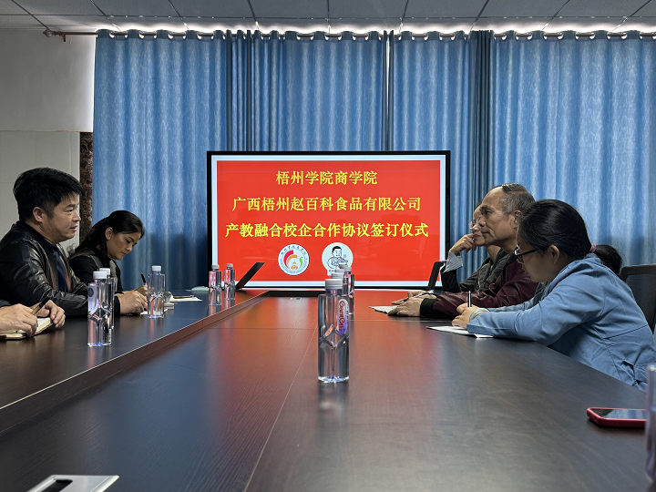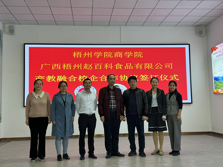为进一步深化教育教学改革,全面推进产教深度融合,更好地为地方经济发展服务,12月15日上午,商学院副院长叶毅带领电子商务专业骨干教师到访广西梧州赵百科食品有限公司(下文简称“赵百科”),双方共同签订了梧州学院教学科研实习基地产教融合校企合作协议,并深入探讨了合作模式。