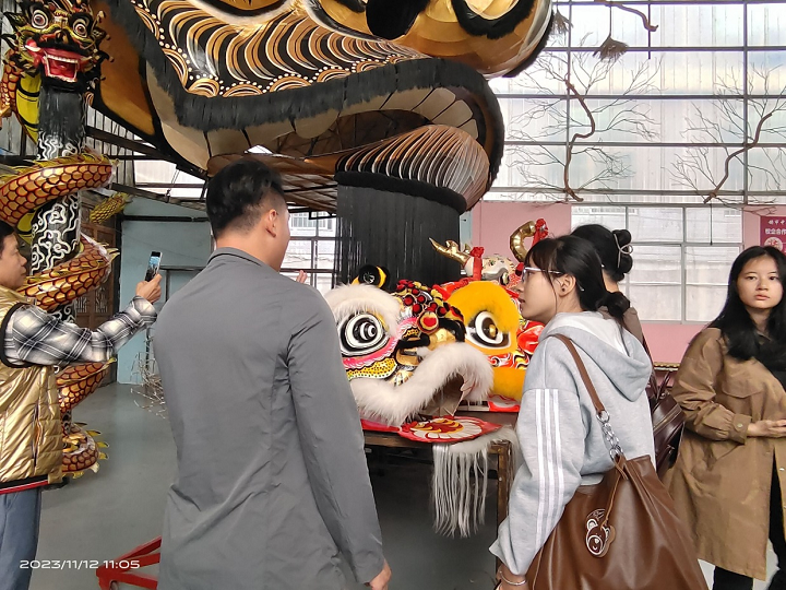 参观过程中,藤县龙狮运动协会会长、藤县舞狮区级传承人祝启春首先向师生介绍了藤县狮舞的辉煌发展历程。藤县狮舞至今已有1297年的历史,其以精湛的技艺闻名于世。2004年,藤县榻洲狮队获得马来西亚第六届云顶世界狮王争霸赛并列第一名,并获得“世界狮王”“东方狮王”称号;2011年被列入第三批国家级非物质文化遗产保护名录;2021年获评中华体育文化优秀项目;在历年的世界级赛事中获得多次冠军。曾登上2019年央视春节联欢晚会,2022年、2023年央视元宵晚会,在央视出品的《中国达人秀》、《我要上春晚》、《开门大吉》、《出彩中国人》等节目中,曾留下了藤县狮舞的精彩表演。