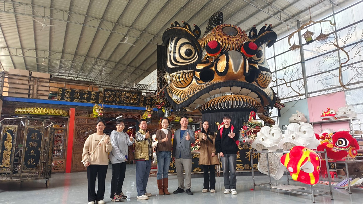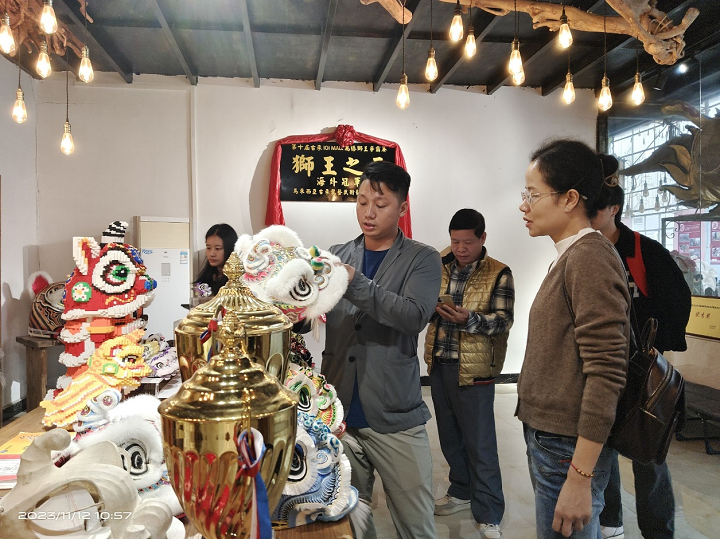 自治区人大代表、广西藤县狮王文化传播有限公司董事长、藤县龙狮运动协会副会长邓彬光接着带领师生参观龙狮扎作艺术馆,深入了解复杂且精湛的狮头扎作技艺。邓副会长还展示了旗下公司所开发的狮王系列文创产品,他希望通过文创赋能“非遗”,让藤县舞狮传统文化火起来、潮起来。