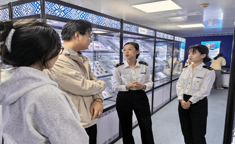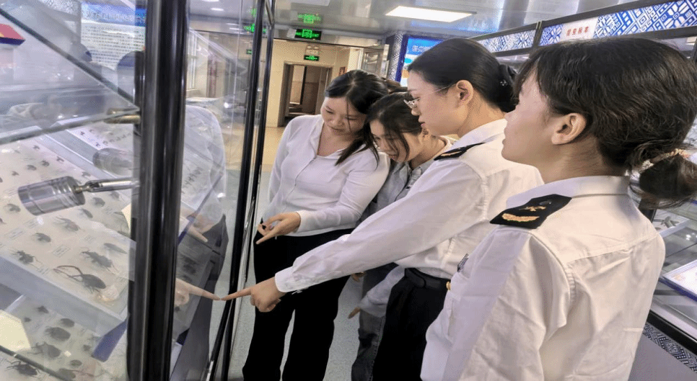 讲解结束后,师生有序参观国门生物展厅。展厅内,海关截获的有害生物、杂草种子、害虫及动物标本琳琅满目,部分标本由之前实习的学生协助制作并标注署名,让同学们倍感亲切。大家近距离观察实物标本,结合专业知识向海关关员提问交流,在互动中深化对检验检疫政策落地场景、非关税措施实践影响的认知,现场同步开展素材采集,为专业学习积累实践案例。