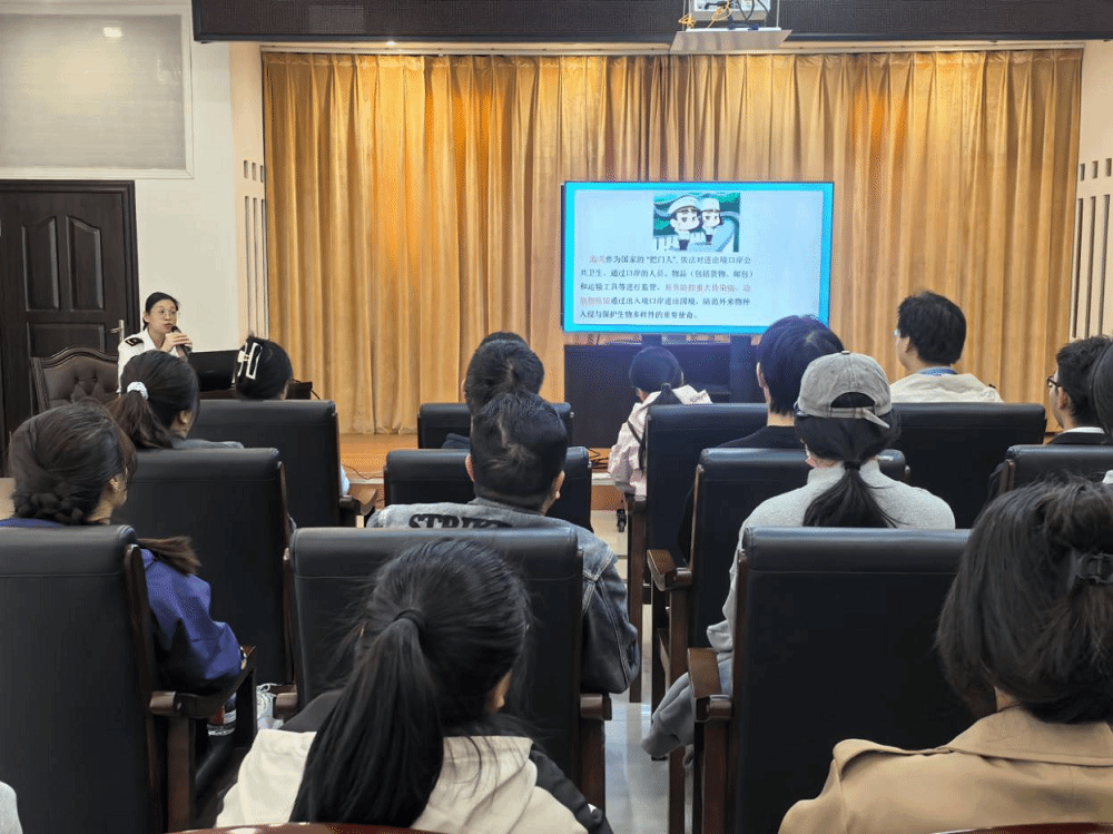 海关关员围绕《中华人民共和国禁止携带、邮寄进境产品及其产品目录》展开专题讲解,结合进出口贸易实际场景,系统介绍检验检疫政策对货物准入的管控要求——从阻断重大动物疫情传播的肉类制品检验,到防范物种入侵的动植物及其产品检疫,让同学们直观了解政策在保障贸易安全、维护公共利益中的现实作用。关员还结合案例解析非关税措施的双重效应:既通过科学管控筑牢国门安全防线,为国内产业与公共卫生保驾护航,也对跨境贸易流程提出规范要求,引导同学们从专业视角辩证看待贸易监管政策。