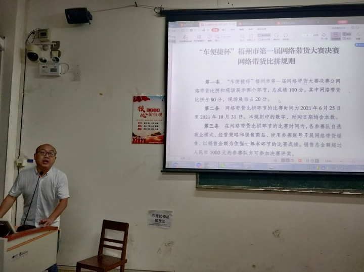 为了更好地推进“车便捷杯”梧州市第一届网络带货大赛决赛阶段的工作,商学院于2021年6月28日在明理楼S301举行决赛动员暨比赛规则讲解会。商学院副院长叶毅到会,他首先对进入决赛的团队表示祝贺,然后进行了决赛阶段的动员发言,希望参赛的团队通过比赛,学以致用,赛得出彩,为学校争光。商学院市场营销教研室主任陈琳对这次决赛的规则进行了详细的解读。最后,由商学院电子商务教研室主任黄冰毅对决赛阶段规定使用的电子商务平台进行了深入的分析。