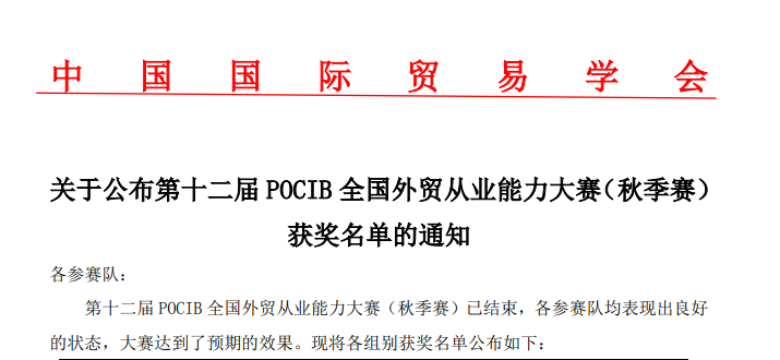 11月8日,第十二届POCIB全国外贸从业能力大赛(秋季赛)结束,由我校商学院国际经济与贸易专业师生组成的2支队伍共计20人报名参赛,最终2支参赛队伍均荣获全国团体一等奖。参赛选手当中,获全国个人一等奖1人、二等奖8人、三等奖7人,共计16人获得个人奖项,个人获奖率达参赛选手总数的80%。