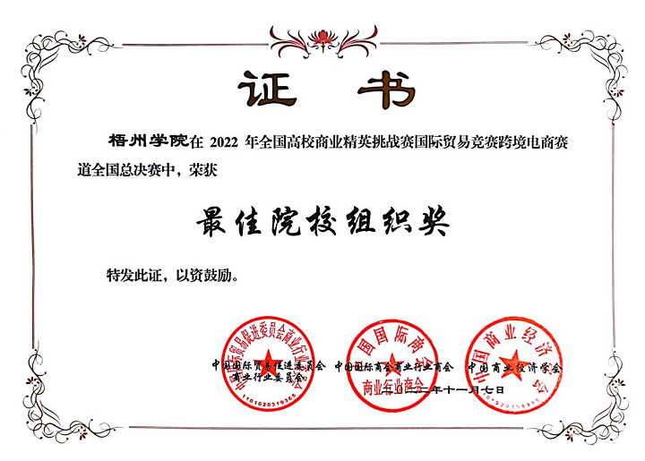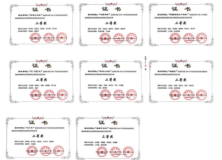 2022年11月7日,由中国国际贸易促进委员会商业行业委员会、中国国际商会商业行业商会和中国商业经济学会主办的“全国高校商业精英挑战赛国际贸易竞赛跨境电商赛道”全国总决赛圆满落幕。由我校国际经济与贸易专业学生组成的14支队伍参加本次比赛,他们经过校赛、区赛、国赛的层层选拔,经过长达9个月漫长比赛,最终14支参赛队中,有6支队伍获得国家级一等奖、7支队伍获得国家级二等奖、1支队伍获得国家级三等奖的优异成绩,我校参赛人数和获奖队伍均创历史新高,获得了最佳院校组织奖。