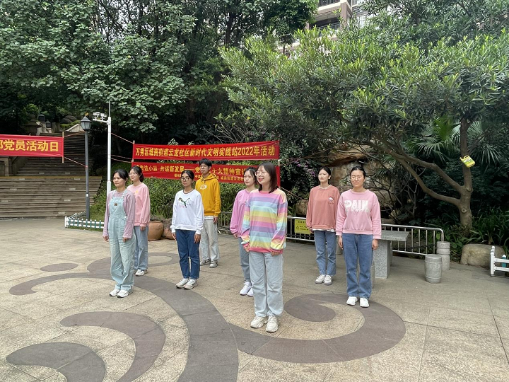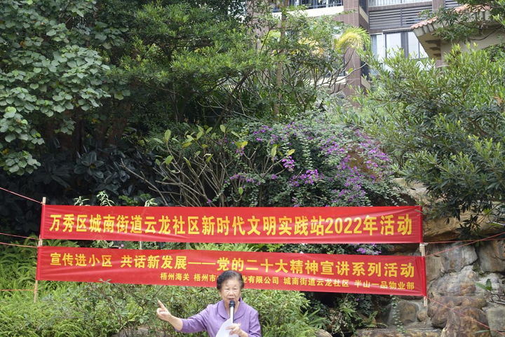 2022年11月22日,梧州学院2019级国际经济与贸易专业实习生在梧州市半山一品小区与梧州海关、梧州市中茗茶业有限公司等单位共同参加由云龙社区委员会主办的党的二十大精神宣讲系列活动。