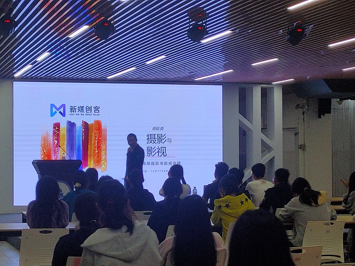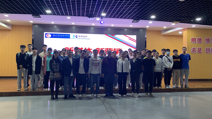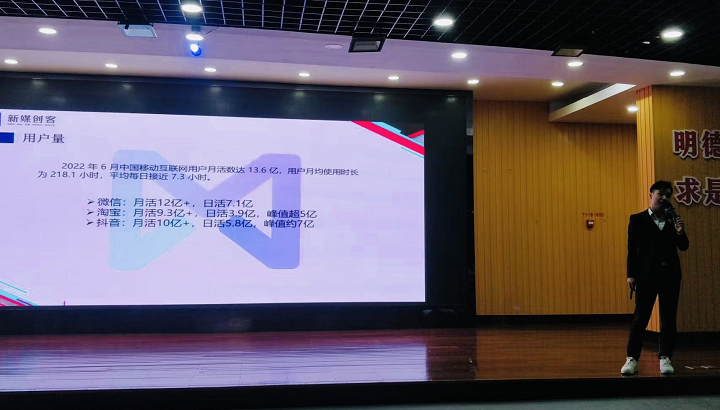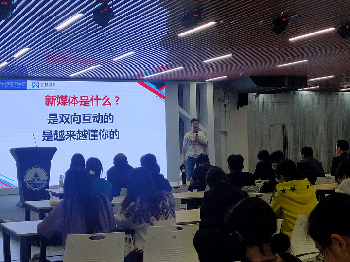 举办新媒体营销培训讲座,是在前期校企良性、持续合作基础上,努力贯彻OBE理念,将实践融入课程建设,融合行业最新发展成果,打造新媒体营销、网络营销等相关优质课程和特色的一项举措,目标是校企合作培养融“知识、能力、素质”三位于一体的电商人才。此次新媒体营销培训讲座共有三个场次,第一个内容是由新媒创客公司执行董事长韦保君作主题为“新电商 新营销”的讲授,韦总主要介绍新媒创客的发展历程以及新媒体的内涵特点。让师生对新媒体有了更深入的理解。第二项内容是由新媒创客公司摄影总监邓邦作主题为“抖音短视频拍摄技巧”的讲座,邓邦主要讲解了视频拍摄的镜头语言、景别类型以及视频剪辑技巧,并结合视频教学、游戏教学等方式进行讲解,内容深入浅出,对学生很有启发。第三项内容由新媒创客短视频&直播电商总监杨龙作主题为“抖音运营技巧”的讲座,杨龙主要介绍了抖音短视频发布技巧以及介绍了短视频行业发展状况,鼓励学生们多关注短视频行业发展,投身到短视频行业,正确合理使用短视频,为宣传梧州、助力乡村振兴贡献力量。