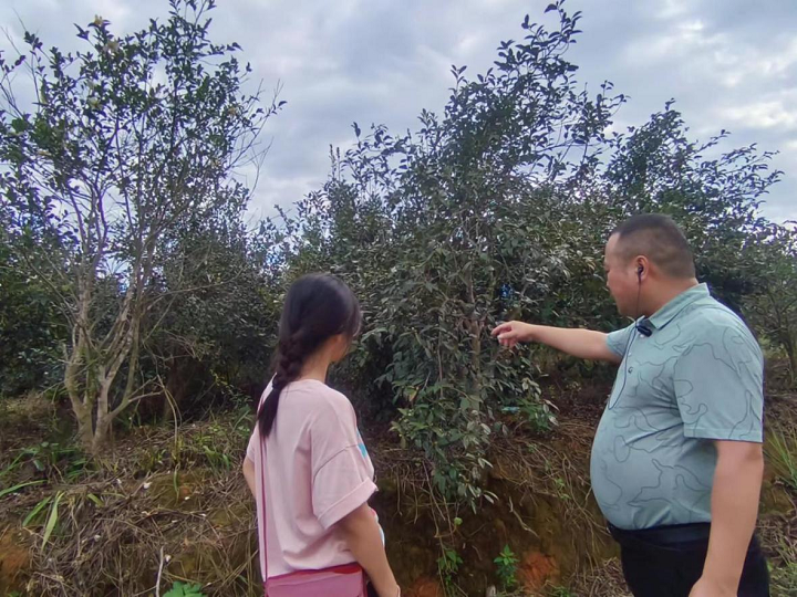 图2 广西绿生缘生物科技有限公司何昌盛总经理向学生介绍油茶种植情况