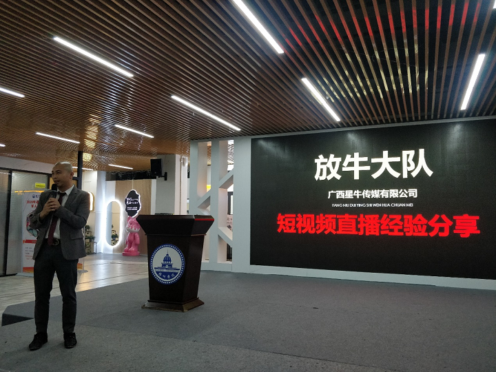 2022年12月1日晚,商学院电子商务教研室邀请广西星牛文化传媒有限公司旗下的“放牛大队”团队,在梧州学院体育馆负一楼邑谷中心,举办了短视频运营经验分享会。电商教研室主任黄冰毅及电子商务专业近百名学生参加了此次分享会。