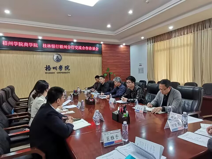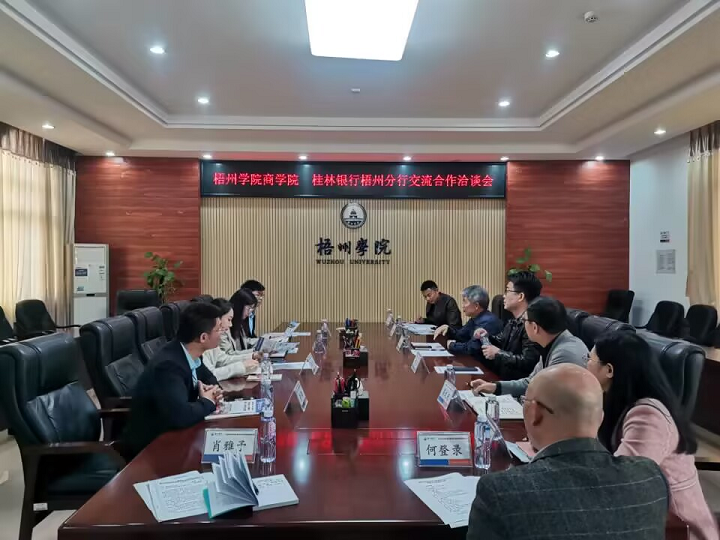 2023年3月7日上午,商学院与桂林银行梧州分行在明理楼八楼第二会议室召开洽谈会,就校企合作进行了深入交流。桂林银行梧州分行党委委员、副行长蒋黎一行莅临学校交流考察。商学院领导班子成员、相关教研室主任、辅导员出席了本次洽谈会。