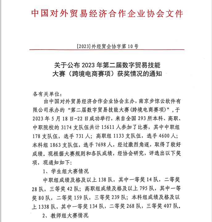 2023年5月22日,由中国对外贸易经济合作企业协会举办、南京步惊云软件有限公司承办的全国第二届数字贸易技能大赛落下帷幕,我校商学院国际经济与贸易专业2021级参赛学生获得好成绩,共有26支队伍荣获奖项。其中,参加国际贸易赛道的1支队伍获得一等奖,2支队伍获得三等奖;参加跨境电商赛道的3支队伍获得一等奖,16支队伍获得二等奖,4支队伍获得三等奖。