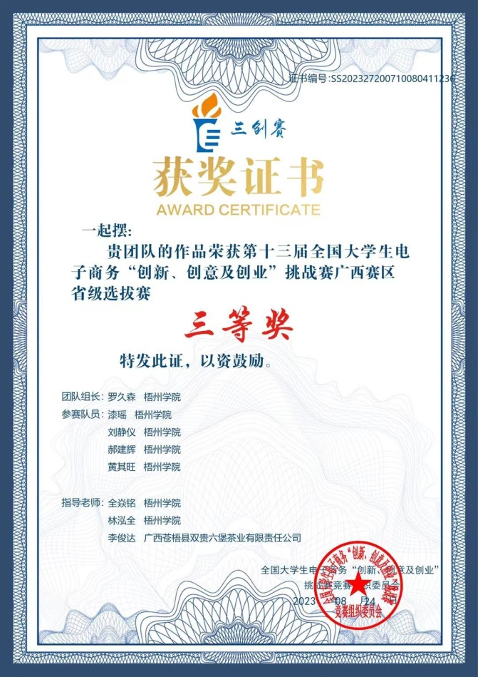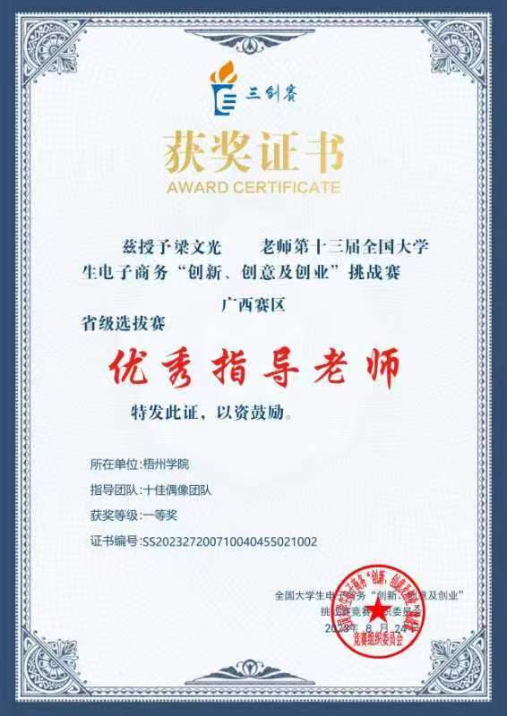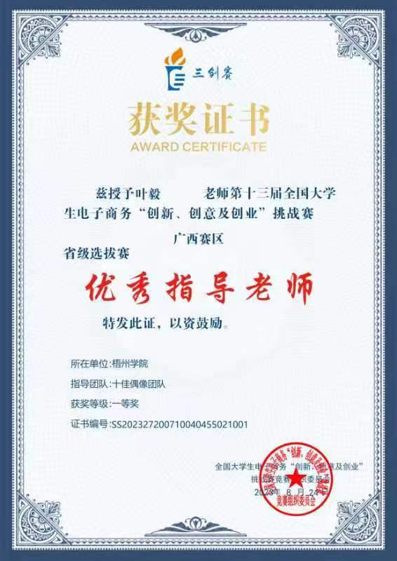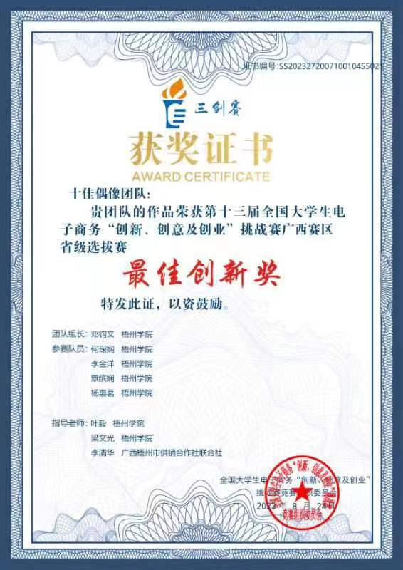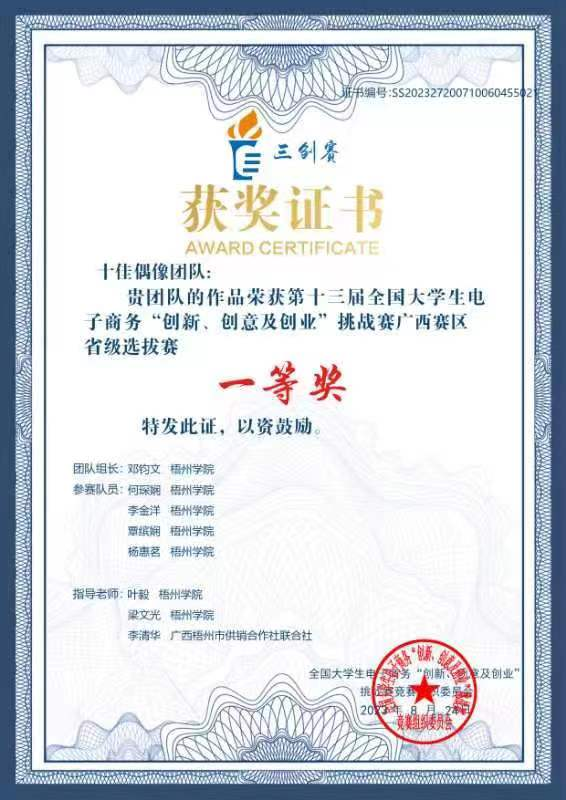 2023年6月10日,第十三届全国大学生电子商务“创新、创意及创业”挑战赛广西赛区省级选拔赛在广西玉林师范学院举行。大赛组委会在近期公布了获奖名单。商学院参赛成绩喜人,两个参赛团队分别获得一等奖和三等奖。其中,由商学院电子商务专业学生为核心成员的十佳偶像团队(指导老师:商学院叶毅、梁文光),获广西赛区一等奖,该队同时还获得“最佳创新奖”,叶毅、梁文光两位教师获得“优秀指导教师”奖励;另一个团队是由金融工程专业、国际经济与贸易专业和数据科学与大数据技术专业学生组成的跨专业“一起摆”团队获广西赛区三等奖(指导老师:商学院全焱铭、大数据与软件工程学院林泓全)。商学院积极组队参加这次比赛,获得佳绩并突破了历史记录。