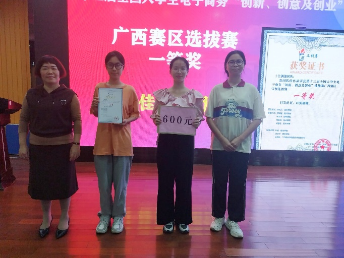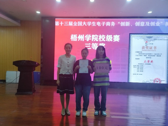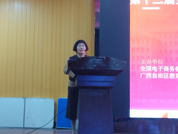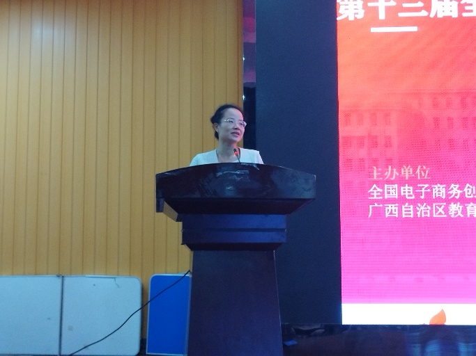 李洁彦副所长受邀上台作颁奖致辞,她首先对获奖团队表示热烈祝贺。她对三创赛的举办非常支持,认为电商三创赛是给学生一个很好的提升自身能力的平台,让同学们能在赛中学、在赛中练,切实提高学生的创新精神、创业意识和创新创业能力。这次比赛是商学院创新创业教育成果的一次集中展现,充分展现了梧州学院学子良好的精神风貌和创新创业能力。