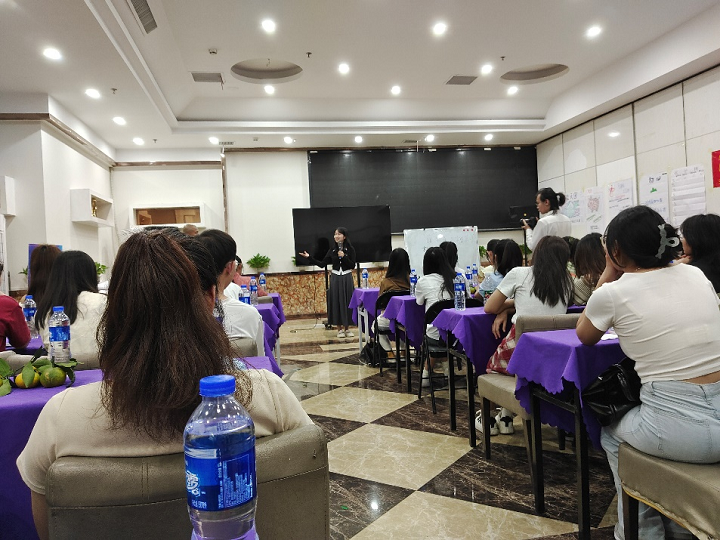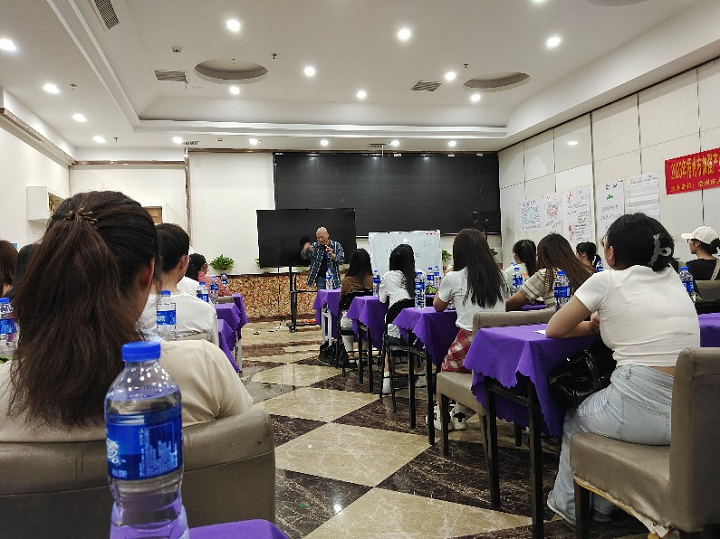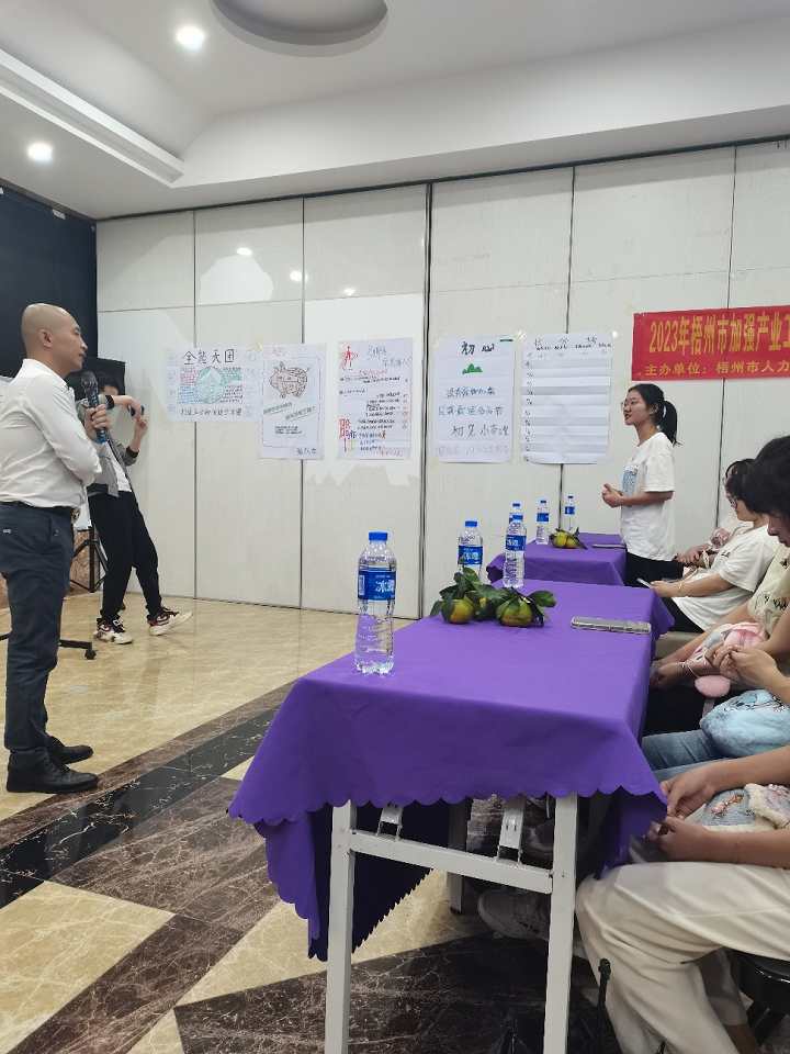 本次参观学习主要以主题为“把握机遇,共创未来”的交流分享会的形式进行。公司的肖总介绍了基地基本情况、学院电子商务专业郑庆花老师介绍参会的师生后,交流分享会开始。首先由公司董事长牛轰上台讲话,他分享了企业做抖音的过去、现在以及未来的设想。接着,梧州本地直播网红者——灿叔分享了其在抖音平台开展短视频电商运营的经验。然后,由公司优秀电商主播罗玉凤分享直播电商带货的经验,她特别强调,带货主播需要熟悉整个带货流程,临场应变能力特别重要,而且讲究团队合作,通过做电商带货实现团队之间的通力合作,培养带货主播的技能,就可以很好地工作中遇到的其他问题。最后,牛轰董事长做交流分享会总结,并由学生自由提问互动交流。