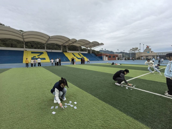 活动现场,在翻纸牌游戏环节,队员们依次从起点线出发,跑到纸牌区翻牌,翻到目标牌后保留,队员们激烈角逐,展现出良好的团队协作精神。