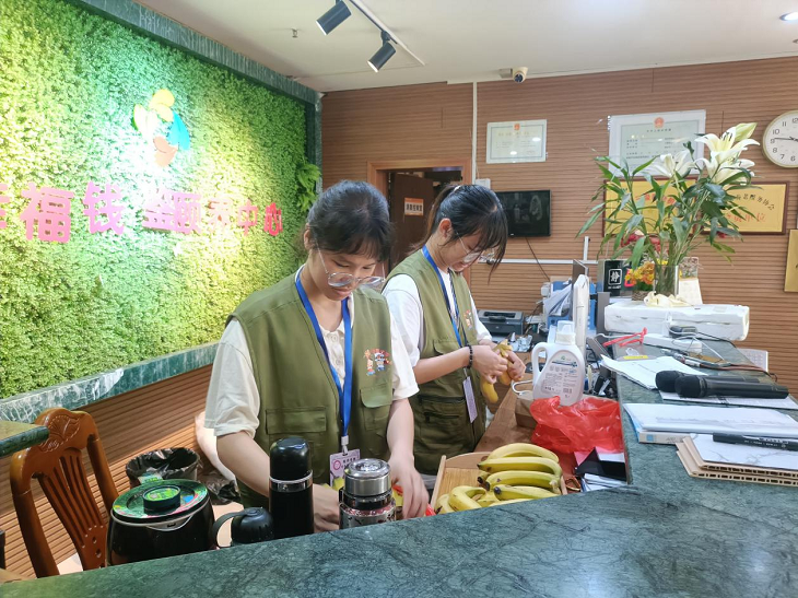 志愿者们为老人准备水果