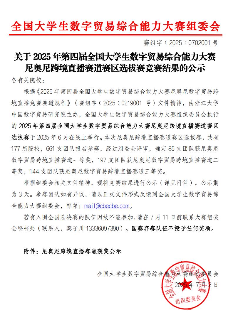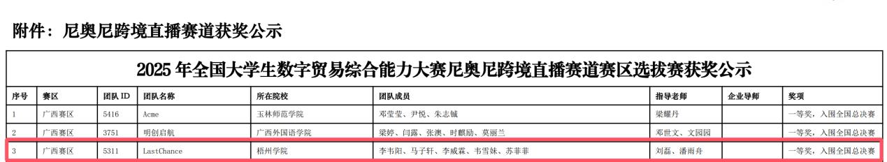 近日,2025 年第四届全国大学生数字贸易综合能力大赛落下帷幕,经济学院国际经济与贸易专业师生在广西赛区尼奥尼跨境直播赛道的激烈角逐中脱颖而出,取得了令人瞩目的优异成绩。参赛的 4 支队伍共获得一等奖1项、二等奖2项、三等奖1项,其中 “LastChance” 队伍以一等奖第 3 名的成绩从全区 56 支队伍中成功晋级全国总决赛,展现了学院学子在数字贸易领域的卓越风采。