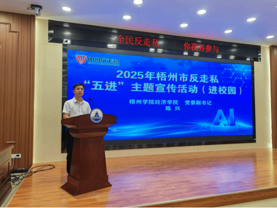 活动中,梧州海关缉私分局吴昊从国家经济安全、市场公平秩序角度,阐述了反走私工作的重要性,呼吁师生主动参与反走私行动。经济学院党委副书记陈兴致辞,他对各主办、协办单位的精心筹备表示感谢,在介绍学院的办学特色基础上,强调了“反走私对未来投身跨境领域的学生而言,既是职业底线,更是社会责任。”