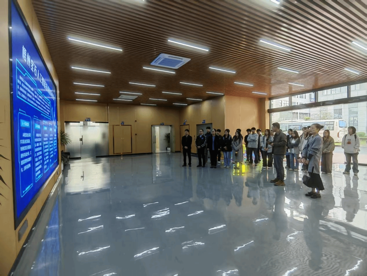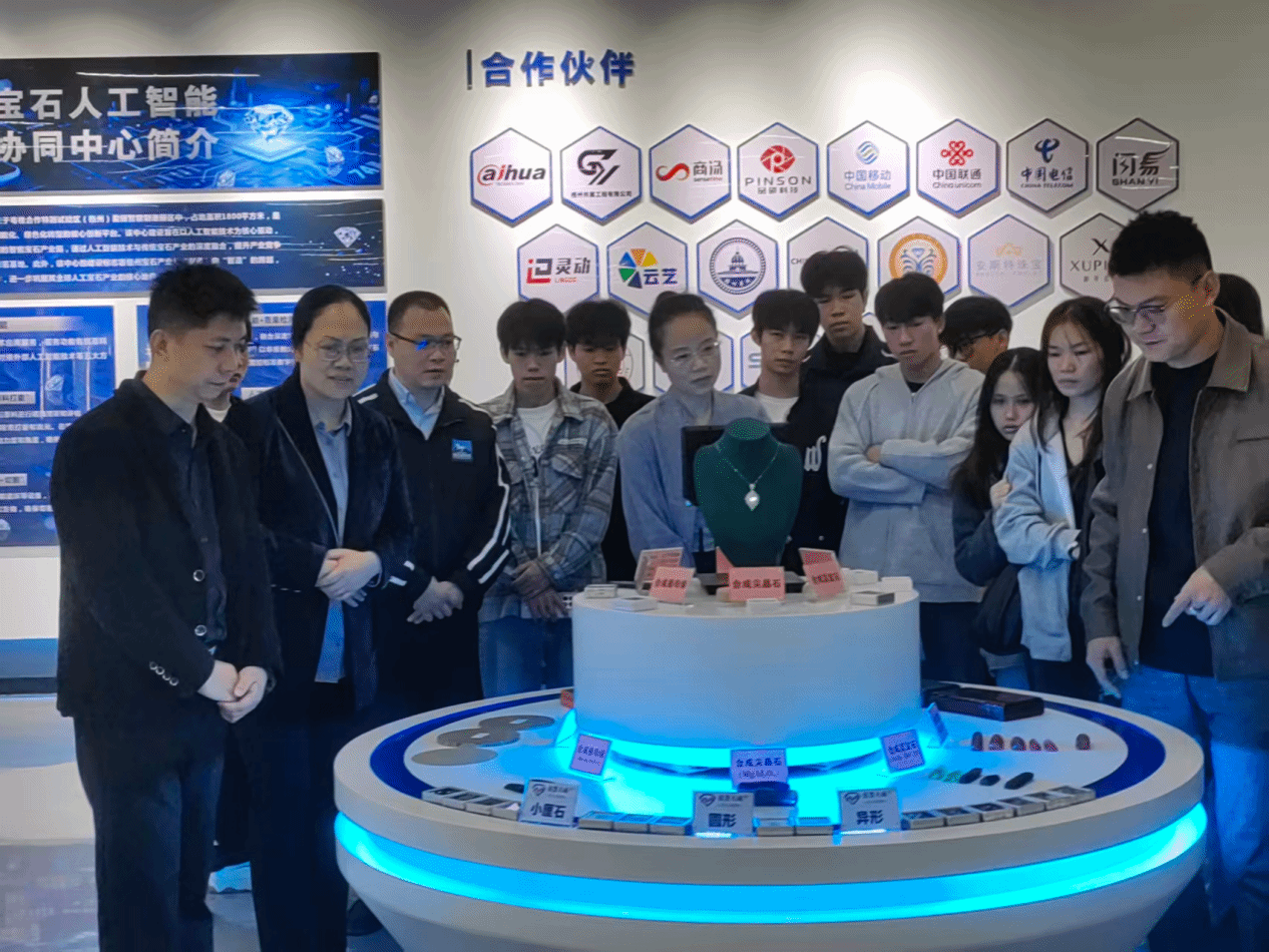 在喜荟天成刘同庆经理的引导下,师生一行首先走进梧州宝石人工智能技术协同中心与生产车间,近距离感受 AI 技术为宝石产业注入的创新活力。从智能切割设备的精准作业到无人打磨机的高效运转,从AI视觉质检机对莫桑钻颜色饱和度、切割对称度的实时检测,到全自动镶嵌技术的精准操作,同学们直观见证了人工智能如何实现宝石加工全链条的提质增效,这让学生对技术赋能创意有了全新认知。