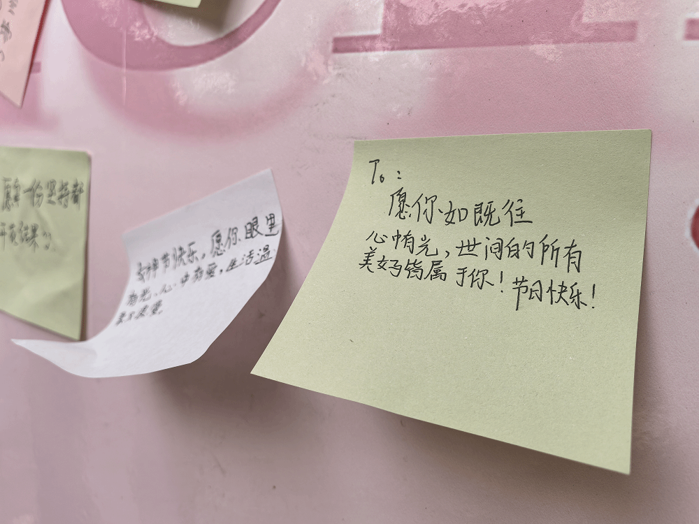 活动现场的“祝福能量墙”前,同学们纷纷写下对女性亲友、师长的牵挂与赞美,短短两小时便贴满百余张便签,每一行字句都是对“她力量”的温柔注解。旁边的“玫瑰派送站”同样人气高涨,经济学院学生干部为路过的女教师、女同学送上鲜花,不少人拿着玫瑰在祝福墙前拍照留念,将春日浪漫定格。