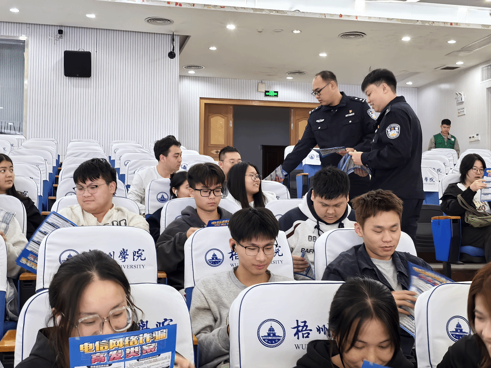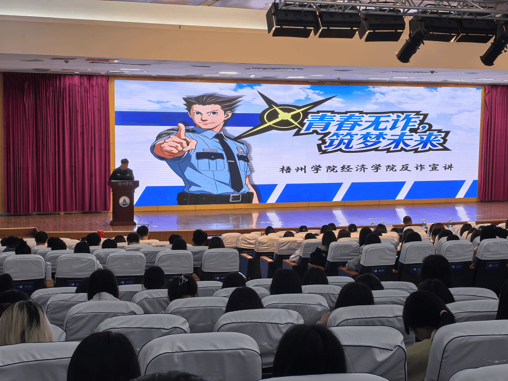 为进一步提高大学生的防诈反诈意识,增强自我保护能力,2026年3月12日,经济学院、马克思主义学院联合梧州市公安局长洲分局数字侦查大队开展“警校携手筑防线,‘经'心防诈护青春”大学生反诈警示教育专题讲座。邀请梧州市公安局长洲分局数字侦查大队李点程现场指导,邀请欧钧涛警官作讲座。400多名学生代表参加讲座。