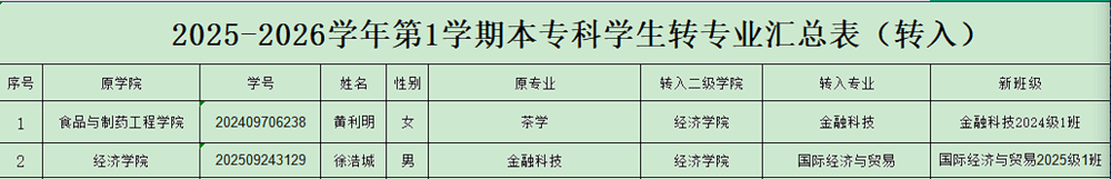 经学生个人申请,学院根据工作方案进行审核,拟同意黄利明等1名学生转入经济学院,另,同意徐浩城从我院金融科技专业转到国际经济与贸易专业,现将名单予以公示,公示期为2025年12月23~25日,共3天。公示期间,如有异议,请以书面形式陈述理由并署真实姓名,于2025年12月25日17:00前交到明理楼M718办公室。