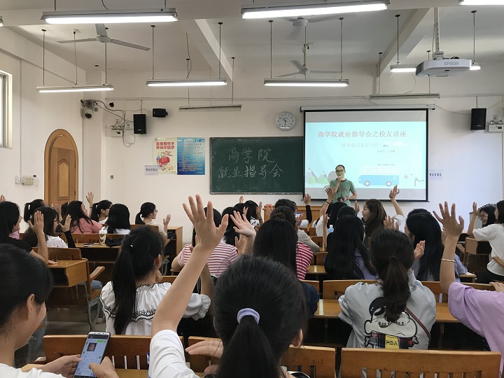 随着2018届毕业生工作完美落幕,2019届毕业生的就业指导工作又被提上日程。为了更细致的落实毕业生指导工作,近日,商学院在明理楼M510举行了主题为《青春,是用来奋斗的》专题讲座,这是商学院2019届毕业生就业指导会系列的首场校友讲座,主讲人是我校2008级工商管理专业毕业生、国家司法考试高分通过者、中央财经大学法律(金融法方向)硕士研究生王书磊,讲座由商学院辅导员蒋小兰主持,60余名学生到场聆听。