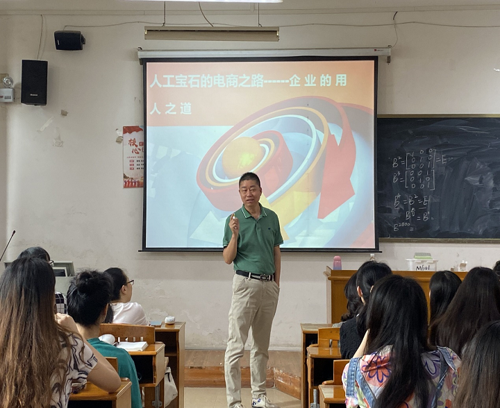 2022年5月19日上午,梧州市正永珠宝有限公司总经理王勇应商学院叶毅副院长的邀请,到梧州学院M601教室,为21电子商务专升本班级的61名学生,以“正永企业人工宝石的电商之路”为题作讲座。