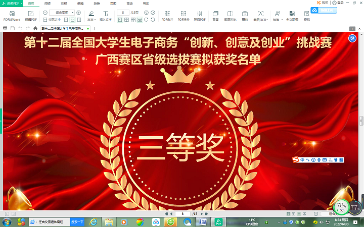 2022年6月18日,由全国电子商务产教融合创新联盟主办,桂林旅游学院、广西本科高校电子商务及物流管理类教学指导委员会承办的第十二届全国大学生电子商务“创新、创意及创业”挑战赛广西区赛省级选拔赛简介(以下简称“三创赛”)在桂林旅游学院成功举行。本次大赛采取线上网络视频的形式进行,全区共有160支参赛团队经过校内选拔进入省赛。梧州学院有4支团队晋级省级赛,其中来自商学院电子商务专业和宝石与艺术设计学院产品设计专业学生共同组成的“梧宝电商”团队(指导老师:叶毅、陈丹枫、唐莉莎;学生:马永秀、蔡夏宁、王宗颖、高倩、张博)获广西区赛三等奖。