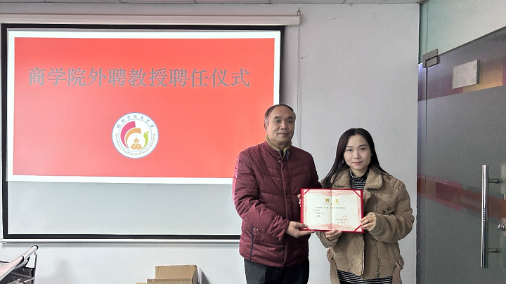 叶毅副院长为梧州市江远宝石公司外贸经理吴君颁发校外指导教师聘书